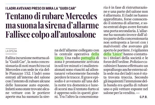 (…) I ladri sono entrati all’interno del Salone con l’intento di rubare alcune delle lussuose auto esposte. Infatti sono state trovate alcune vetture con le portiere aperte ma ha suonato la sirena dell’allarme collegato con  la c entrale operativa de La Lince. (…)